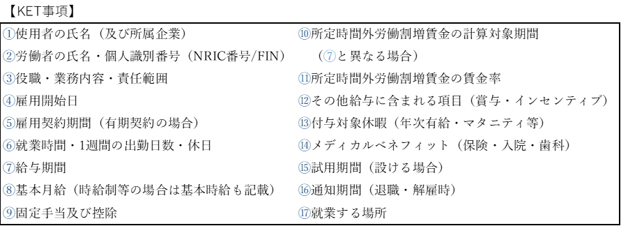 ・雇用契約締結時には使用者及び労働者間で17個の重要事項(Key Employment Terms:KET事項)の合意が義務付けられている: